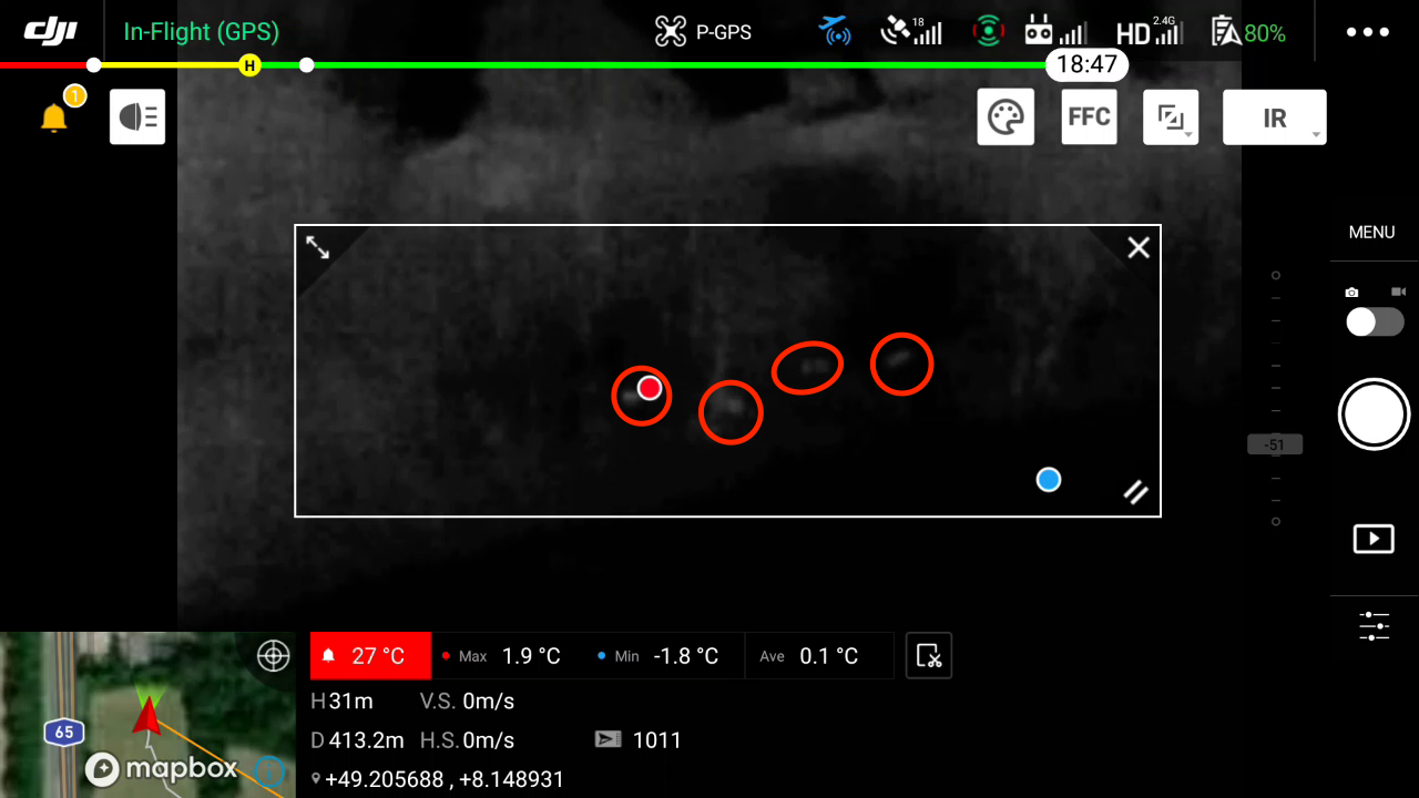 Nach erneuter Rücksprache mit der Feuerwehr wurde dem Team ein weiteres etwa 54ha großes Gebiet zugewiesen, auf welchem alle Wege und deren Randbereiche kontrolliert werden sollten. Auch hier zeigten sich außer einigen Wildtieren (Bild 1) im angrenzenden Waldstück keine weiteren Temperaturauffälligkeiten.