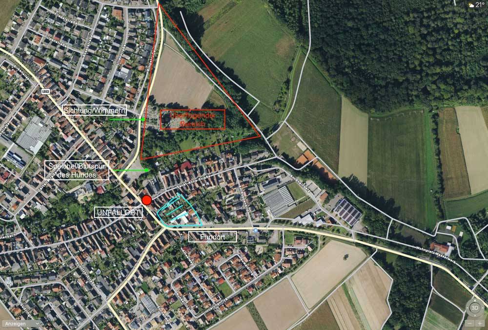 Vor Ort meldeten wir uns noch mal bei der Polizei an und besprachen mit diesen den Ablauf. Danach liefen wir mit einem Unfallzeugen, Tanja Axmann und einem Freund des Hundebesitzers die nähere Umgebung ab und machten uns ein Bild der Situation sowie der Örtlichkeiten, da eine Speichel/Blutspur des Hundes nahe der Unfallstelle gefunden worden war. Ausserdem gab es eine vermutliche Sichtung des Hundes im Bereich des örtlichen Friedhofes, hier wurde durch eine Anwohnerin ein Wimmern und Jaules eines Hundes wenige Minuten nach dem Unfall vernommen. Nach dem Eintreffen von Roman Rossel, Drohnensuche Karlsruhe, besprachen ich mit ihm die Lage. Unter Einfluss verschiedener Faktoren, die Einschätzung des Hundesicherungsteams so wie der Erfahrung von Roman Rossel legten wir ein Gebiet im Bereich um den Friedhof fest, welches auf Grund seiner Beschaffenheit (Maisfeld kurz vor der Ernte) und Größe ohne Drohne durch den Einsatz von vielen Helfern hätte durchkämmt werden müssen. Obwohl die Suche in diesem Bereich ohne Sichtung endete, konnte zur Erleichterung der vor Ort suchenden Kräfte ein großer Bereich ausgeschlossen werden und so das Suchgebiet auf andere Regionen verfeinert werden.
