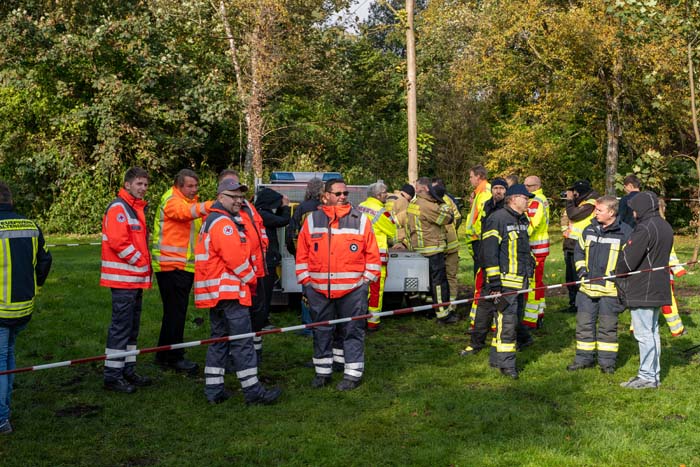 Im Laufe des Tages zeigte sich auch, wie wichtig es ist, dass sich die einzelnen Team-Mitglieder innerhalb einer Einheit verstehen und kommunizieren. Das Einsatzgebiet selber war durch eine Baumreihe vom Start- u. Landeplatz getrennt, so dass der Pilot seine Drohne teilweise nicht mehr im Blick haben konnte. Da ist es dann wichtig, sich auf einen Spotter verlassen zu können, der dann eindeutige Fluganweisungen gibt. Auch der Luftraumbeobachter hatte seine wichtige Aufgabe zu erfüllen. Immer wieder kamen Greifvögel zu Besuch, die sich doch sehr für die Drohnen interessierten. Der Bildauswerter hingegen hatte die Verantwortung, dass alle Vermissten gefunden wurden.