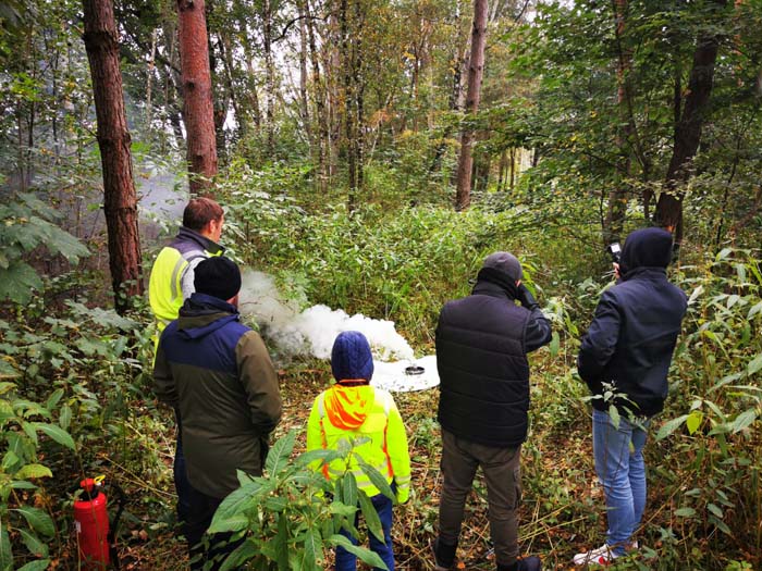 Der Waldbrand wurde durch Rauchtöpfe dargestellt, die von einem Mitglied des Vereins gezündet wurden. Die jeweilige Drohneneinheit hatte die Aufgabe, die GPS-Koordinaten des Ursprungsortes zu ermitteln und an die Einsatzleitung zu übermitteln.