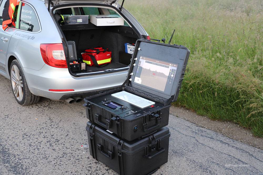 Für den Abend haben wir uns entschieden noch nicht weiter aufzubauen und erst einmal abzuwarten, welches Lagezentrum zuerst Bedarf meldet. Gegen Mitternacht rief dann auch das LZ RLP an, wollte aber nur noch mal genauere Informationen, was wir in Bereitschaft haben und ob wir auch nachtflugtauglich sind. Obwohl diese Daten alle schon schriftlich vorlagen, haben wir erneut alles gemeldet. Nach einer kurzen Nacht in ungemütlichen Autos wurde am Samstag, den 17.07. dann zumindest schon mal der Tisch und die Stromversorgung aufgebaut. In Reken wurde schon am Freitag eine Telefonzentrale eingerichtet und die Einsatzsoftware in Betrieb genommen. So konnten wir ab 8 Uhr auch eine Festnetznummer anbieten. Von dort aus wurde unser Hilfsangebot auch an andere Einsatzleitungen gemeldet. Alle Piloten haben sich mit ihrem Equipment auch da eintragen lassen.